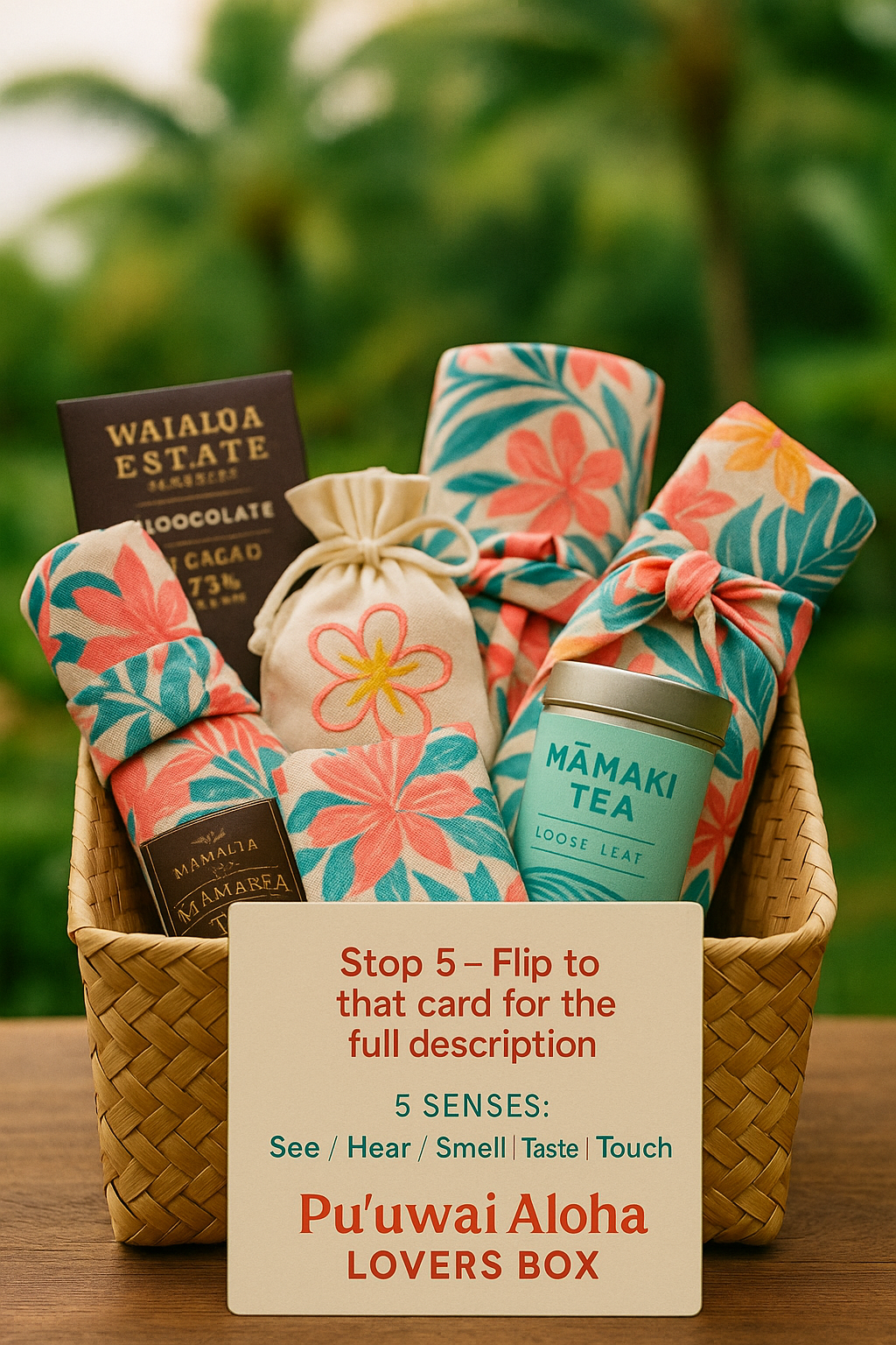 Sensory treasures: artisan Hawaiian chocolate, plumeria-inspired scent sachets, a silky keepsake scarf, and soothing mamaki tea.